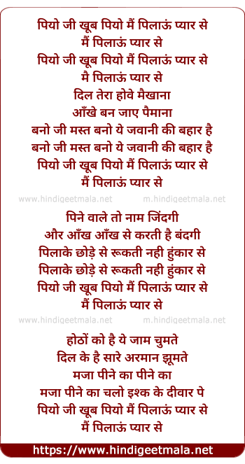 Lyrics of Peeo Ji Khub Peeo - पियो जी खूब पियो मैं पिलाऊं प्यार से