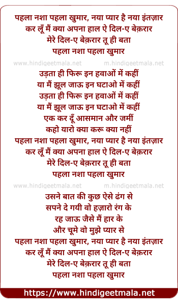 Lyrics of Pehla Nasha Pehla Nasha - पहला नशा पहला खुमार, नया प्यार है नया इंतज़ार