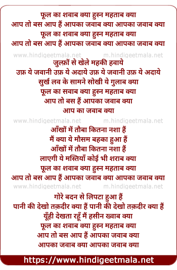 Lyrics of Phool Ka Shabab Kya, Husn Mahatab Kya - फूल का शवाब क्या हुस्न महताब क्या