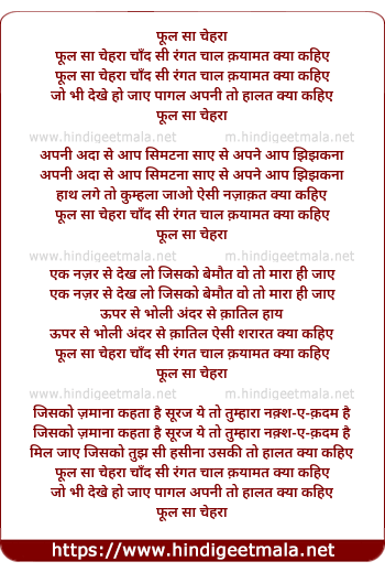 Lyrics of Phool Sa Chehra Chaand Si Rangat - फूल सा चेहरा चाँद सी रंगत
