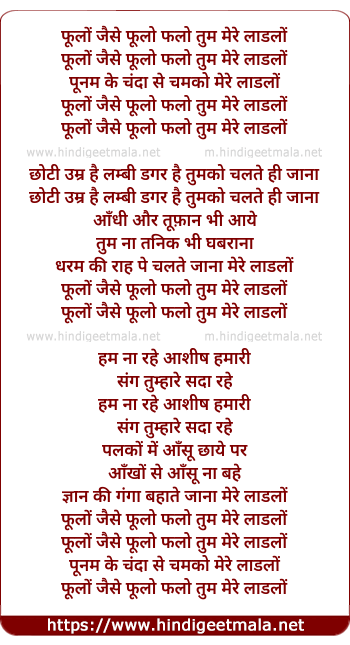 Lyrics of Phoolo Jaise Phoolo Phalo - फूलों जैसे फूलो फलो