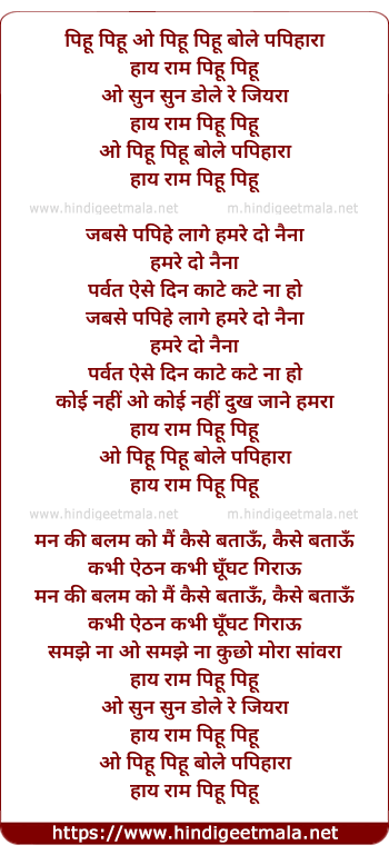 Lyrics of Pihu Pihu Bole Papihara - पिहू पिहू बोले पपिहारा