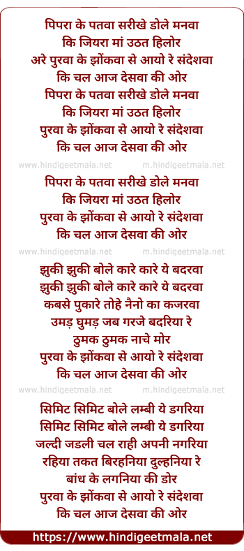 Lyrics of Piparaa Ke Patavaa Sarikhe Dole Manavaa - पिपरा के पतवा सरीखे डोले मनवा