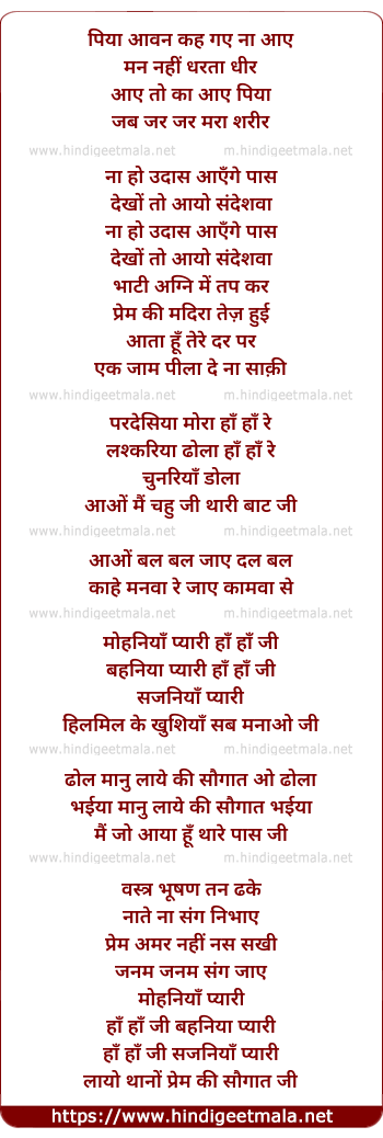 Lyrics of Piya Aavan Kah Gaye Na Aaye (Na Ho Udas Ayenge Pass) - पिया आवन कह गए ना आए