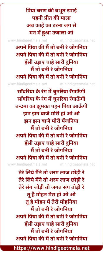 Lyrics of Piya Charan Kee Babhut Ramayee - पिया चरण की बभूत रमायी