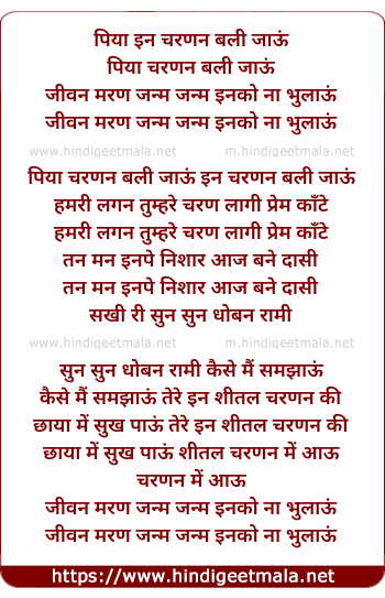 Lyrics of Piya In Charanan Bali Jaaon - पिया इन चरणन बली जाऊं