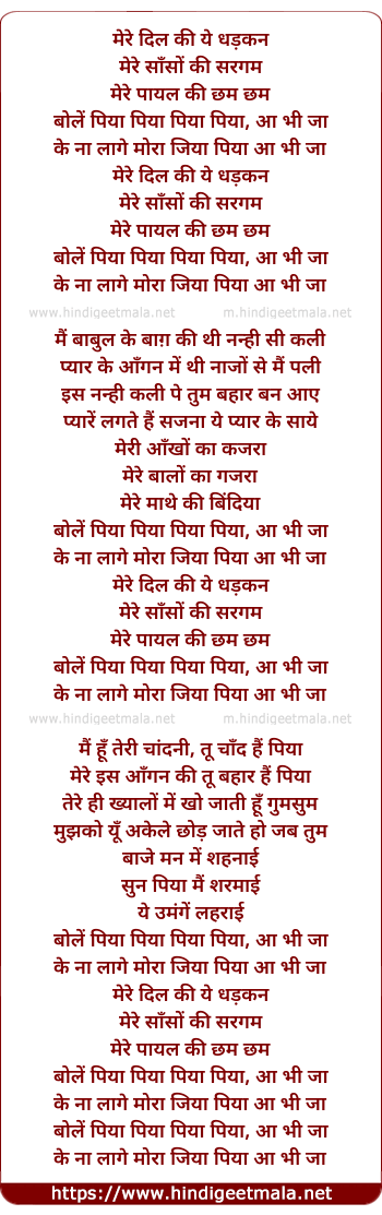 Lyrics of Piya Piya (Tanya Singh) - मेरे दिल की ये धड़कन