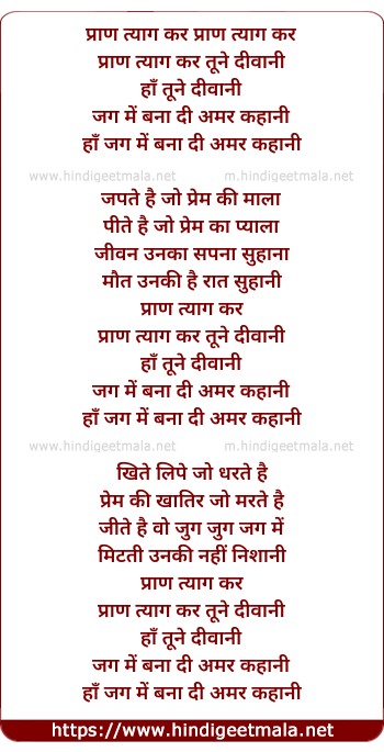 Lyrics of Pran Tyag Kar Tune Diwani - प्राण त्याग कर तूने दीवानी