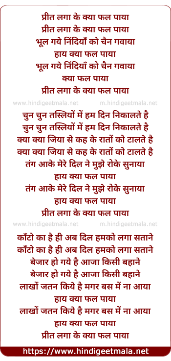 Lyrics of Preet Laga Ke Kya Phal Paya - प्रीत लगा के क्या फल पाया