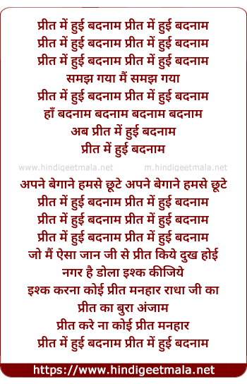 Lyrics of Preet Mein Hui Badnaam - प्रीत में हुई बदनाम प्रीत में हुई बदनाम
