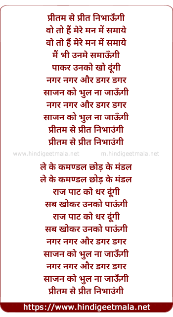 Lyrics of Preetam Se Preet Nibhaungi - प्रीतम से प्रीत निभाऊँगी