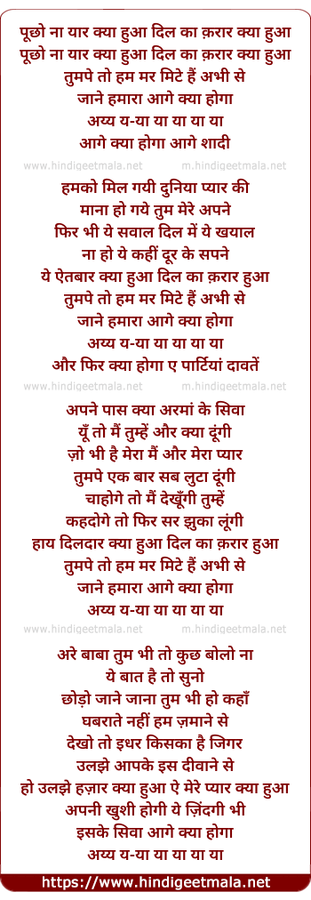 Lyrics of Puchho Naa Yaar Kyaa Huaa Dil Kaa Qaraar Kyaa Huaa - पूछो ना यार क्या हुआ दिल का क़रार क्या हुआ