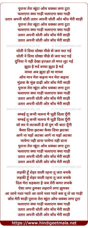 Lyrics of Purana Tera Khunta, Dhakka Laga Tuta - पुराना तेरा खूंटा, धक्का लगा टूटा
