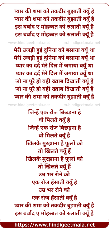 Lyrics of Pyaar Ki Shama - प्यार की शमा को तकदीर बुझाती क्यूँ है