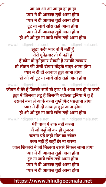 Lyrics of Pyaar Ne Di Aawaaz Tujhe Aana Hoga - प्यार ने दी आवाज़ तुझे आना होगा