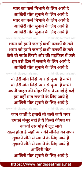 Lyrics of Pyar Ka Farz Nibhane Ke Liye Aaye Hai, Aakhari Geet Sunane Ke Liye - प्यार का फर्ज निभाने के लिए आये है , आखिरी गीत सुनाने के लिए आये है