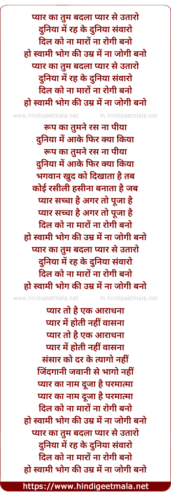 Lyrics of Pyaar Ka Tum Badla Pyaar Se Utaaro - प्यार का तुम बदला प्यार से उतारो