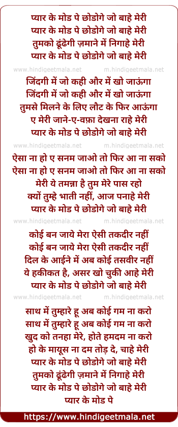 Lyrics of Pyar Ke Mod Pe Chhodoge Jo Baahe Meri - प्यार के मोड पे छोडोगे जो बाहे मेरी