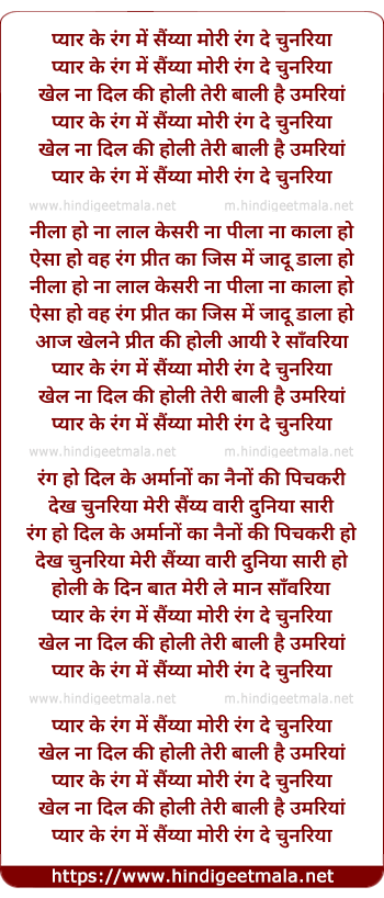 Lyrics of Pyar Ke Rang Me Saiyan Mori Rang De Chunariya - प्यार के रंग में सैंय्या मोरी रंग दे चुनरिया
