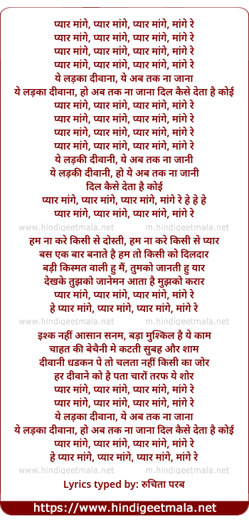 Lyrics of Pyar Mange, Pyar Mange, Mange Re - प्यार मांगे, प्यार मांगे, मांगे रे