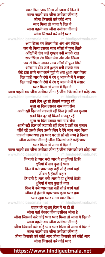 Lyrics of Pyar Mila To Jaana Yeh Dil Ne - प्यार मिला प्यार मिला तो जाना ये दिल ने