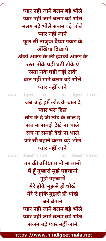Lyrics of Pyar Nahi Jane Balam Bade Bhole - प्यार नहीं जाने बलम बड़े भोले