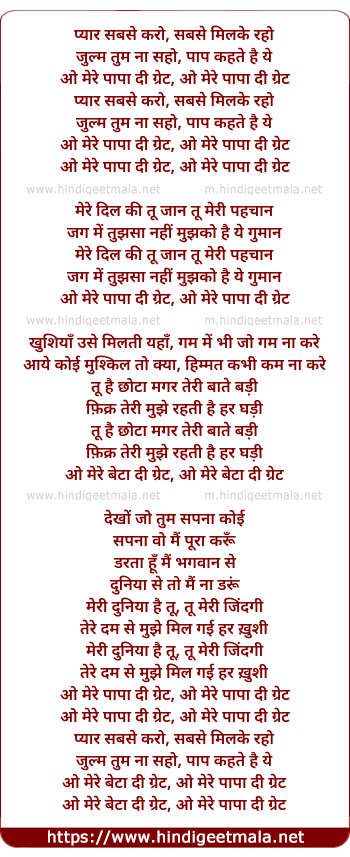 Lyrics of Pyar Sabse Karo O Mere Papa The Great - प्यार सबसे करो ओ मेरे पापा दा ग्रेट