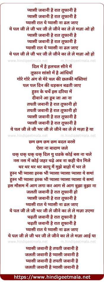 Lyrics of Pyasi Jawani Hai, Raat Tufani Hai - प्यासी जवानी है, रात तूफानी है