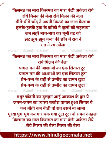 Lyrics of Qismat Kaa Maaraa Panchhi Akelaa Roye - किसमत का मारा