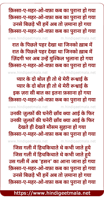 Lyrics of Qissaa E Mahar O Wafaa Kab Kaa Puraanaa Ho Gayaa - क़िस्सा-ए-महर-ओ-वफ़ा कब का पुराना हो गया