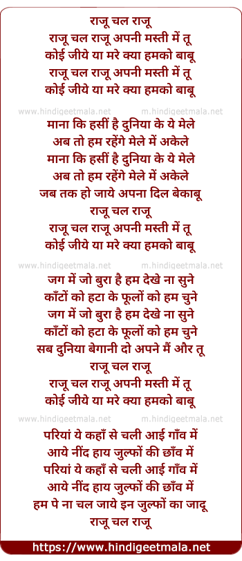 Lyrics of Raaju Chal Raaju Apani Masti Men Tu - राजू चल राजू अपनी मस्ती में तू