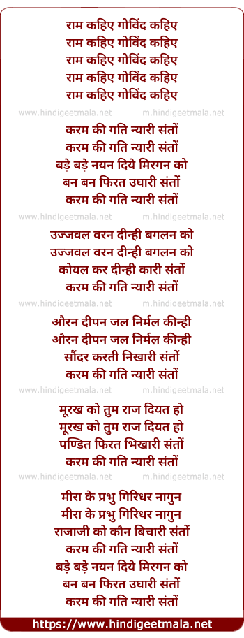 Lyrics of Raam Kahie Govind Kahie, Karam Ki Gati Nyaari - राम कहिए गोविंद कहिए