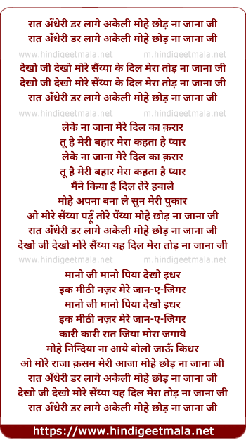 Lyrics of Raat Andheri Dar Laage Yaki Mori Chhod Na Jana - रात अँधेरी डर लागे अकेली मोहे छोड़ ना जाना जी