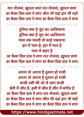 darr kaisa dil daav pe laga raat naujawa, jhumta sama