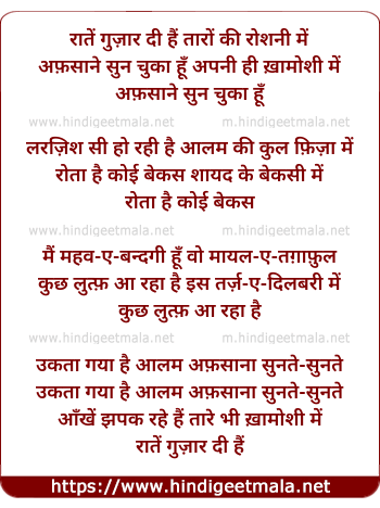 Lyrics of Raaten Guzaar Di Hain Taaron Ki Roshani Men - रातें गुज़ार दी हैं तारों की रोशनी में