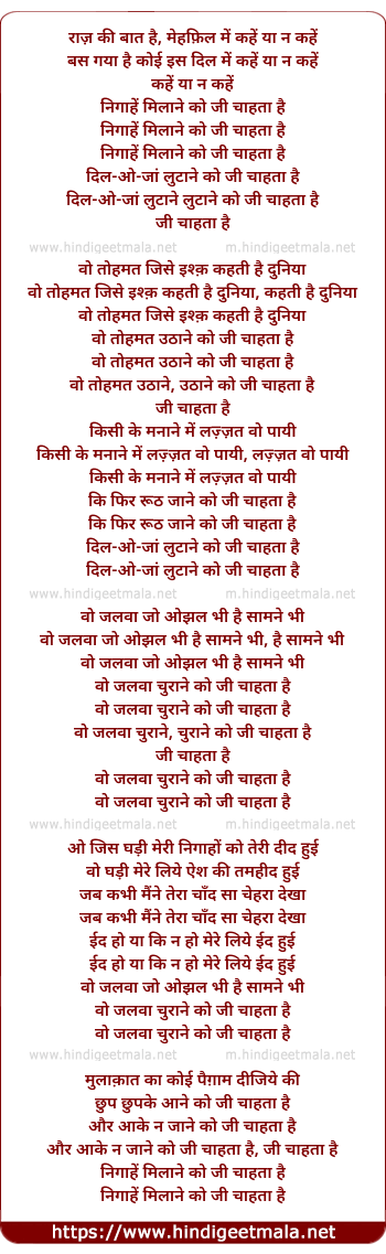 Lyrics of Raaz Ki Baat Hai, Nigaahen Milaane Ko Ji Chaahataa Hai - राज़ की बात है, निगाहें मिलाने को जी चाहता है