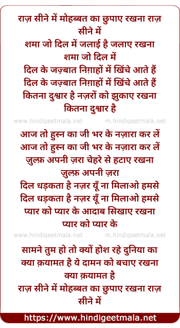 Lyrics of Raaz Sine Me Mohabbat Ka - राज़ सीने में मोहब्बत का छुपाए रखना राज़ सीने में
