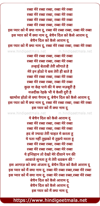 Lyrics of Rabba Mere Rabba Rabba, Is Pyar Ko Mai Kya - रब्बा मेरे रब्बा रब्बा, इस प्यार को मैं क्या