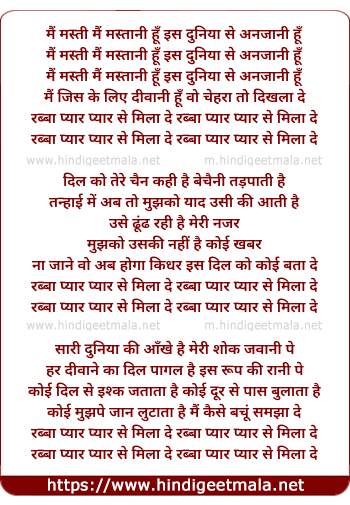 Lyrics of Rabba Pyaar Se Mila De - रब्बा प्यार से मिला दे
