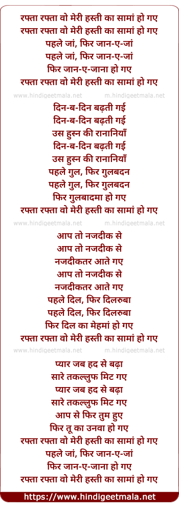 Lyrics of Rafta Rafta O Meri Hasti Ha Sama - रफ्ता रफ्ता वो मेरी हस्ती का सामां हो गए