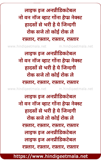 Film CastMukesh Tiwari, Abhay Bhargava, Narendra Bedi, Mukesh Rishi, Lopa Bhatt, Alok Nath, Tunisha Pawar, Aryan Singh, Vishal Kaushik, Suresh ChatwalSingerSukhwinder Singh, Nisha Lalwani, Preeta Mazumdar, Kumar SanuLyricistRashid FirozabadiMusic ByNitin RaikwarDirectorVicky KumarProducerSunil KumarExternal LinksRaftaar - An Obsession at IMDB YouTubeRaftaar - An Obsession at YT