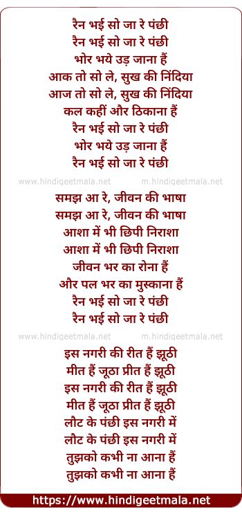 Lyrics of Rain Bhayi So Jaa Re Panchhi - रैन भई सो जा रे पंछी