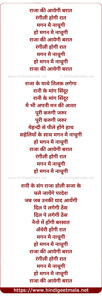 Lyrics of Raja Ki Ayegi Baraat - राजा की आयेगी बरात