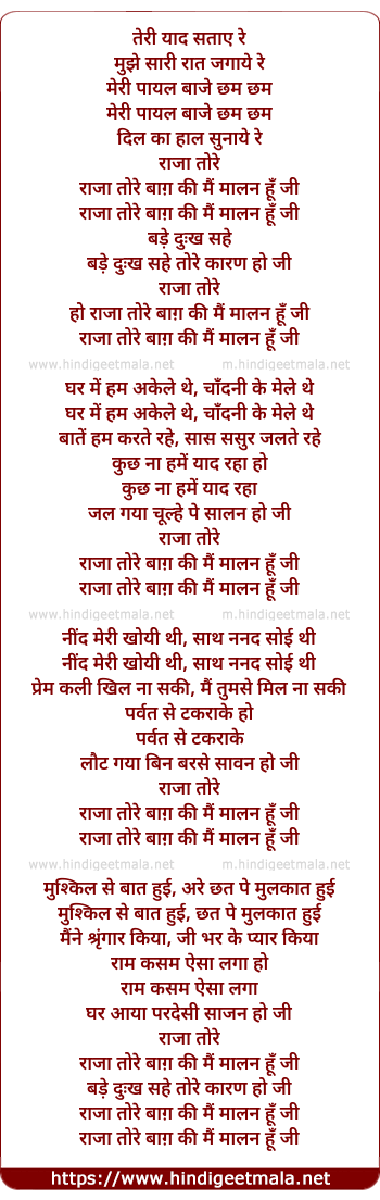 Lyrics of Teri Yaad Sataye Re, Raja Tore Baag Ki Main Malan Hu Ji - तेरी याद सताए रे, राजा तोरे बाग़ की मैं मालन हूँ जी