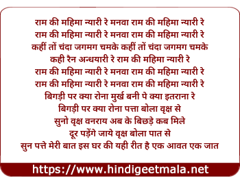 Lyrics of Ram Ki Mahima Nyari Re Manva - राम की महिमा न्यारी रे मनवा
