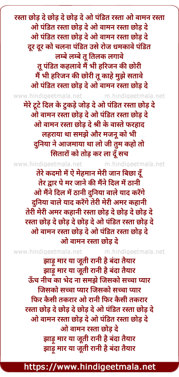 Lyrics of Rasta Chod De - रस्ता छोड़ दे छोड़ दे छोड़ दे ओ पंडित रस्ता ओ वामन रस्ता
