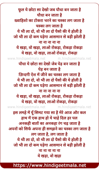 Lyrics of Wo Khada Laao Rokda, Phool Ye Chota Sa Dekho - वो खड़ा लाओ रोकड़ा, फूल ये छोटा सा देखो