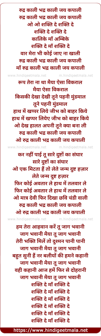 Lyrics of Rudra Kali Bhadra Kali Jai Kali - रुद्र काली भद्र काली जय कपाली