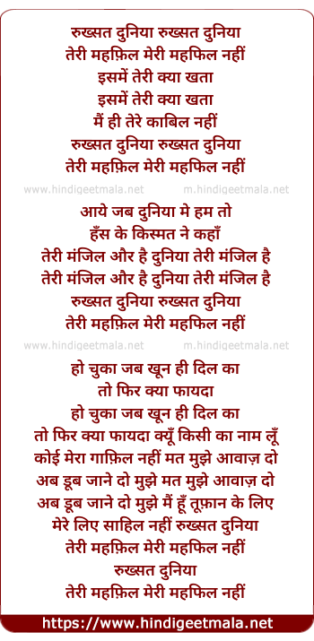 Lyrics of Rukhsat Duniya Teri Mehfil Meri - रुख्सत दुनिया तेरी महफ़िल मेरी
