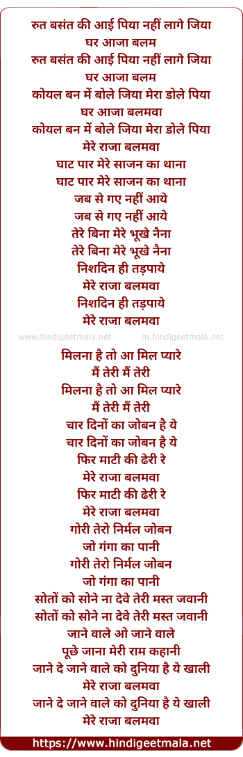Lyrics of Rut Basant Ki Aayi - रुत बसंत की आई पिया नहीं लागे जिया